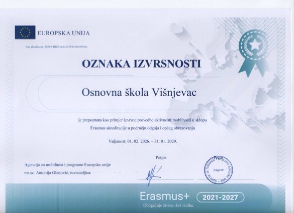 Posebno nam je zadovoljstvo i čast istaknuti da je naša škola dobitnica Oznake izvrsnosti (Excellence Label) za provedbu mobilnosti u sklopu Erasmus akreditacije u području odgoja i općeg obrazovanja. Ovo priznanje potvrda je našeg dugogodišnjeg sustavnog rada, predanosti visokoj kvaliteti provedbe projekata te kontinuiranog unaprjeđenja međunarodne suradnje.