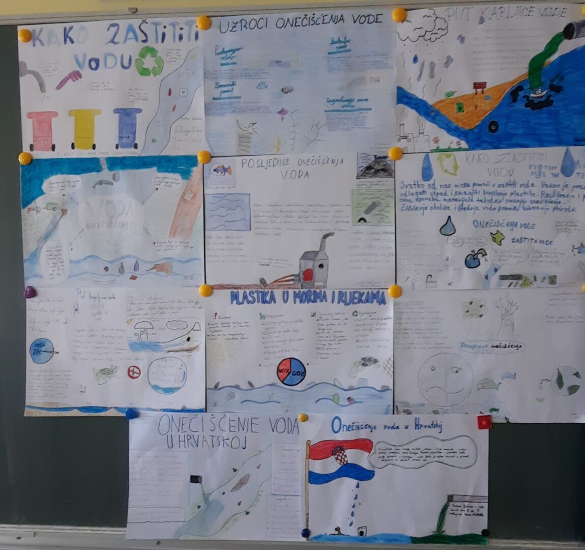 Kroz rad u parovima izrađivali su plakate na različite podnaslove; Uzroci i posljedice onečišćenja voda, plastika u morima i rijekama, načini zaštite voda, stanje onečišćenja u Hrvatskoj te „Put kapljice vode“.